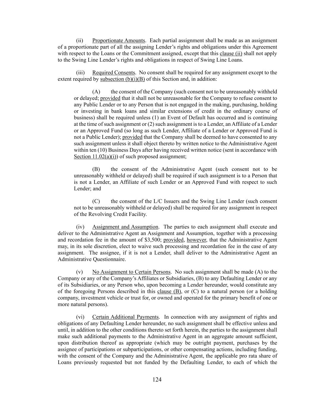 124 (ii) Proportionate Amounts. Each partial assignment shall be made as an assignment of a proportionate part of all the assigning Lender’s rights and obligations under this Agreement with respect to the Loans or the Commitment assigned, except that this clause (ii) shall not apply to the Swing Line Lender’s rights and obligations in respect of Swing Line Loans. (iii) Required Consents. No consent shall be required for any assignment except to the extent required by subsection (b)(i)(B) of this Section and, in addition: (A) the consent of the Company (such consent not to be unreasonably withheld or delayed; provided that it shall not be unreasonable for the Company to refuse consent to any Public Lender or to any Person that is not engaged in the making, purchasing, holding or investing in bank loans and similar extensions of credit in the ordinary course of business) shall be required unless (1) an Event of Default has occurred and is continuing at the time of such assignment or (2) such assignment is to a Lender, an Affiliate of a Lender or an Approved Fund (so long as such Lender, Affiliate of a Lender or Approved Fund is not a Public Lender); provided that the Company shall be deemed to have consented to any such assignment unless it shall object thereto by written notice to the Administrative Agent within ten (10) Business Days after having received written notice (sent in accordance with Section 11.02(a)(i)) of such proposed assignment; (B) the consent of the Administrative Agent (such consent not to be unreasonably withheld or delayed) shall be required if such assignment is to a Person that is not a Lender, an Affiliate of such Lender or an Approved Fund with respect to such Lender; and (C) the consent of the L/C Issuers and the Swing Line Lender (such consent not to be unreasonably withheld or delayed) shall be required for any assignment in respect of the Revolving Credit Facility. (iv) Assignment and Assumption. The parties to each assignment shall execute and deliver to the Administrative Agent an Assignment and Assumption, together with a processing and recordation fee in the amount of $3,500; provided, however, that the Administrative Agent may, in its sole discretion, elect to waive such processing and recordation fee in the case of any assignment. The assignee, if it is not a Lender, shall deliver to the Administrative Agent an Administrative Questionnaire. (v) No Assignment to Certain Persons. No such assignment shall be made (A) to the Company or any of the Company’s Affiliates or Subsidiaries, (B) to any Defaulting Lender or any of its Subsidiaries, or any Person who, upon becoming a Lender hereunder, would constitute any of the foregoing Persons described in this clause (B), or (C) to a natural person (or a holding company, investment vehicle or trust for, or owned and operated for the primary benefit of one or more natural persons). (vi) Certain Additional Payments. In connection with any assignment of rights and obligations of any Defaulting Lender hereunder, no such assignment shall be effective unless and until, in addition to the other conditions thereto set forth herein, the parties to the assignment shall make such additional payments to the Administrative Agent in an aggregate amount sufficient, upon distribution thereof as appropriate (which may be outright payment, purchases by the assignee of participations or subparticipations, or other compensating actions, including funding, with the consent of the Company and the Administrative Agent, the applicable pro rata share of Loans previously requested but not funded by the Defaulting Lender, to each of which the