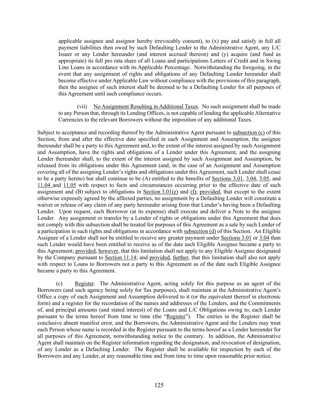 125 applicable assignee and assignor hereby irrevocably consent), to (x) pay and satisfy in full all payment liabilities then owed by such Defaulting Lender to the Administrative Agent, any L/C Issuer or any Lender hereunder (and interest accrued thereon) and (y) acquire (and fund as appropriate) its full pro rata share of all Loans and participations Letters of Credit and in Swing Line Loans in accordance with its Applicable Percentage. Notwithstanding the foregoing, in the event that any assignment of rights and obligations of any Defaulting Lender hereunder shall become effective under Applicable Law without compliance with the provisions of this paragraph, then the assignee of such interest shall be deemed to be a Defaulting Lender for all purposes of this Agreement until such compliance occurs. (vii) No Assignment Resulting in Additional Taxes. No such assignment shall be made to any Person that, through its Lending Offices, is not capable of lending the applicable Alternative Currencies to the relevant Borrowers without the imposition of any additional Taxes. Subject to acceptance and recording thereof by the Administrative Agent pursuant to subsection (c) of this Section, from and after the effective date specified in each Assignment and Assumption, the assignee thereunder shall be a party to this Agreement and, to the extent of the interest assigned by such Assignment and Assumption, have the rights and obligations of a Lender under this Agreement, and the assigning Lender thereunder shall, to the extent of the interest assigned by such Assignment and Assumption, be released from its obligations under this Agreement (and, in the case of an Assignment and Assumption covering all of the assigning Lender’s rights and obligations under this Agreement, such Lender shall cease to be a party hereto) but shall continue to be (A) entitled to the benefits of Sections 3.01, 3.04, 3.05, and 11.04 and 11.05 with respect to facts and circumstances occurring prior to the effective date of such assignment and (B) subject to obligations in Section 3.01(e) and (f); provided, that except to the extent otherwise expressly agreed by the affected parties, no assignment by a Defaulting Lender will constitute a waiver or release of any claim of any party hereunder arising from that Lender’s having been a Defaulting Lender. Upon request, each Borrower (at its expense) shall execute and deliver a Note to the assignee Lender. Any assignment or transfer by a Lender of rights or obligations under this Agreement that does not comply with this subsection shall be treated for purposes of this Agreement as a sale by such Lender of a participation in such rights and obligations in accordance with subsection (d) of this Section. An Eligible Assignee of a Lender shall not be entitled to receive any greater payment under Sections 3.01 or 3.04 than such Lender would have been entitled to receive as of the date such Eligible Assignee became a party to this Agreement; provided, however, that this limitation shall not apply to any Eligible Assignee designated by the Company pursuant to Section 11.14; and provided, further, that this limitation shall also not apply with respect to Loans to Borrowers not a party to this Agreement as of the date such Eligible Assignee became a party to this Agreement. (c) Register. The Administrative Agent, acting solely for this purpose as an agent of the Borrowers (and such agency being solely for Tax purposes), shall maintain at the Administrative Agent’s Office a copy of each Assignment and Assumption delivered to it (or the equivalent thereof in electronic form) and a register for the recordation of the names and addresses of the Lenders, and the Commitments of, and principal amounts (and stated interest) of the Loans and L/C Obligations owing to, each Lender pursuant to the terms hereof from time to time (the “Register”). The entries in the Register shall be conclusive absent manifest error, and the Borrowers, the Administrative Agent and the Lenders may treat each Person whose name is recorded in the Register pursuant to the terms hereof as a Lender hereunder for all purposes of this Agreement, notwithstanding notice to the contrary. In addition, the Administrative Agent shall maintain on the Register information regarding the designation, and revocation of designation, of any Lender as a Defaulting Lender. The Register shall be available for inspection by each of the Borrowers and any Lender, at any reasonable time and from time to time upon reasonable prior notice.