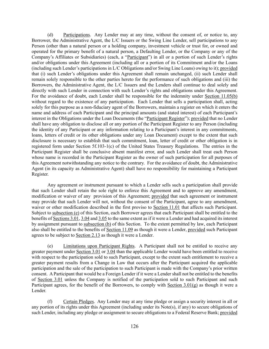 126 (d) Participations. Any Lender may at any time, without the consent of, or notice to, any Borrower, the Administrative Agent, the L/C Issuers or the Swing Line Lender, sell participations to any Person (other than a natural person or a holding company, investment vehicle or trust for, or owned and operated for the primary benefit of a natural person, a Defaulting Lender, or the Company or any of the Company’s Affiliates or Subsidiaries) (each, a “Participant”) in all or a portion of such Lender’s rights and/or obligations under this Agreement (including all or a portion of its Commitment and/or the Loans (including such Lender’s participations in L/C Obligations and/or Swing Line Loans) owing to it); provided that (i) such Lender’s obligations under this Agreement shall remain unchanged, (ii) such Lender shall remain solely responsible to the other parties hereto for the performance of such obligations and (iii) the Borrowers, the Administrative Agent, the L/C Issuers and the Lenders shall continue to deal solely and directly with such Lender in connection with such Lender’s rights and obligations under this Agreement. For the avoidance of doubt, each Lender shall be responsible for the indemnity under Section 11.05(b) without regard to the existence of any participation. Each Lender that sells a participation shall, acting solely for this purpose as a non-fiduciary agent of the Borrowers, maintain a register on which it enters the name and address of each Participant and the principal amounts (and stated interest) of each Participant’s interest in the Obligations under the Loan Documents (the “Participant Register”); provided that no Lender shall have any obligation to disclose all or any portion of the Participant Register to any Person (including the identity of any Participant or any information relating to a Participant’s interest in any commitments, loans, letters of credit or its other obligations under any Loan Document) except to the extent that such disclosure is necessary to establish that such commitment, loan, letter of credit or other obligation is in registered form under Section 5f.103-1(c) of the United States Treasury Regulations. The entries in the Participant Register shall be conclusive absent manifest error, and such Lender shall treat each Person whose name is recorded in the Participant Register as the owner of such participation for all purposes of this Agreement notwithstanding any notice to the contrary. For the avoidance of doubt, the Administrative Agent (in its capacity as Administrative Agent) shall have no responsibility for maintaining a Participant Register. Any agreement or instrument pursuant to which a Lender sells such a participation shall provide that such Lender shall retain the sole right to enforce this Agreement and to approve any amendment, modification or waiver of any provision of this Agreement; provided that such agreement or instrument may provide that such Lender will not, without the consent of the Participant, agree to any amendment, waiver or other modification described in the first proviso to Section 11.01 that affects such Participant. Subject to subsection (e) of this Section, each Borrower agrees that each Participant shall be entitled to the benefits of Sections 3.01, 3.04 and 3.05 to the same extent as if it were a Lender and had acquired its interest by assignment pursuant to subsection (b) of this Section. To the extent permitted by law, each Participant also shall be entitled to the benefits of Section 11.09 as though it were a Lender, provided such Participant agrees to be subject to Section 2.13 as though it were a Lender. (e) Limitations upon Participant Rights. A Participant shall not be entitled to receive any greater payment under Section 3.01 or 3.04 than the applicable Lender would have been entitled to receive with respect to the participation sold to such Participant, except to the extent such entitlement to receive a greater payment results from a Change in Law that occurs after the Participant acquired the applicable participation and the sale of the participation to such Participant is made with the Company’s prior written consent. A Participant that would be a Foreign Lender if it were a Lender shall not be entitled to the benefits of Section 3.01 unless the Company is notified of the participation sold to such Participant and such Participant agrees, for the benefit of the Borrowers, to comply with Section 3.01(g) as though it were a Lender. (f) Certain Pledges. Any Lender may at any time pledge or assign a security interest in all or any portion of its rights under this Agreement (including under its Note(s), if any) to secure obligations of such Lender, including any pledge or assignment to secure obligations to a Federal Reserve Bank; provided