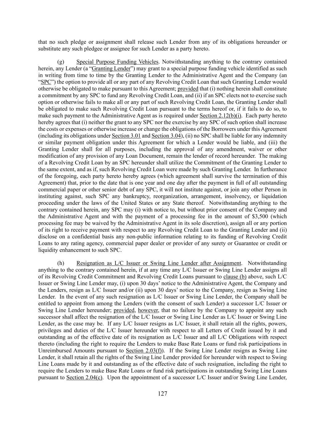 127 that no such pledge or assignment shall release such Lender from any of its obligations hereunder or substitute any such pledgee or assignee for such Lender as a party hereto. (g) Special Purpose Funding Vehicles. Notwithstanding anything to the contrary contained herein, any Lender (a “Granting Lender”) may grant to a special purpose funding vehicle identified as such in writing from time to time by the Granting Lender to the Administrative Agent and the Company (an “SPC”) the option to provide all or any part of any Revolving Credit Loan that such Granting Lender would otherwise be obligated to make pursuant to this Agreement; provided that (i) nothing herein shall constitute a commitment by any SPC to fund any Revolving Credit Loan, and (ii) if an SPC elects not to exercise such option or otherwise fails to make all or any part of such Revolving Credit Loan, the Granting Lender shall be obligated to make such Revolving Credit Loan pursuant to the terms hereof or, if it fails to do so, to make such payment to the Administrative Agent as is required under Section 2.12(b)(i). Each party hereto hereby agrees that (i) neither the grant to any SPC nor the exercise by any SPC of such option shall increase the costs or expenses or otherwise increase or change the obligations of the Borrowers under this Agreement (including its obligations under Section 3.01 and Section 3.04), (ii) no SPC shall be liable for any indemnity or similar payment obligation under this Agreement for which a Lender would be liable, and (iii) the Granting Lender shall for all purposes, including the approval of any amendment, waiver or other modification of any provision of any Loan Document, remain the lender of record hereunder. The making of a Revolving Credit Loan by an SPC hereunder shall utilize the Commitment of the Granting Lender to the same extent, and as if, such Revolving Credit Loan were made by such Granting Lender. In furtherance of the foregoing, each party hereto hereby agrees (which agreement shall survive the termination of this Agreement) that, prior to the date that is one year and one day after the payment in full of all outstanding commercial paper or other senior debt of any SPC, it will not institute against, or join any other Person in instituting against, such SPC any bankruptcy, reorganization, arrangement, insolvency, or liquidation proceeding under the laws of the United States or any State thereof. Notwithstanding anything to the contrary contained herein, any SPC may (i) with notice to, but without prior consent of the Company and the Administrative Agent and with the payment of a processing fee in the amount of $3,500 (which processing fee may be waived by the Administrative Agent in its sole discretion), assign all or any portion of its right to receive payment with respect to any Revolving Credit Loan to the Granting Lender and (ii) disclose on a confidential basis any non-public information relating to its funding of Revolving Credit Loans to any rating agency, commercial paper dealer or provider of any surety or Guarantee or credit or liquidity enhancement to such SPC. (h) Resignation as L/C Issuer or Swing Line Lender after Assignment. Notwithstanding anything to the contrary contained herein, if at any time any L/C Issuer or Swing Line Lender assigns all of its Revolving Credit Commitment and Revolving Credit Loans pursuant to clause (b) above, such L/C Issuer or Swing Line Lender may, (i) upon 30 days’ notice to the Administrative Agent, the Company and the Lenders, resign as L/C Issuer and/or (ii) upon 30 days’ notice to the Company, resign as Swing Line Lender. In the event of any such resignation as L/C Issuer or Swing Line Lender, the Company shall be entitled to appoint from among the Lenders (with the consent of such Lender) a successor L/C Issuer or Swing Line Lender hereunder; provided, however, that no failure by the Company to appoint any such successor shall affect the resignation of the L/C Issuer or Swing Line Lender as L/C Issuer or Swing Line Lender, as the case may be. If any L/C Issuer resigns as L/C Issuer, it shall retain all the rights, powers, privileges and duties of the L/C Issuer hereunder with respect to all Letters of Credit issued by it and outstanding as of the effective date of its resignation as L/C Issuer and all L/C Obligations with respect thereto (including the right to require the Lenders to make Base Rate Loans or fund risk participations in Unreimbursed Amounts pursuant to Section 2.03(f)). If the Swing Line Lender resigns as Swing Line Lender, it shall retain all the rights of the Swing Line Lender provided for hereunder with respect to Swing Line Loans made by it and outstanding as of the effective date of such resignation, including the right to require the Lenders to make Base Rate Loans or fund risk participations in outstanding Swing Line Loans pursuant to Section 2.04(c). Upon the appointment of a successor L/C Issuer and/or Swing Line Lender,