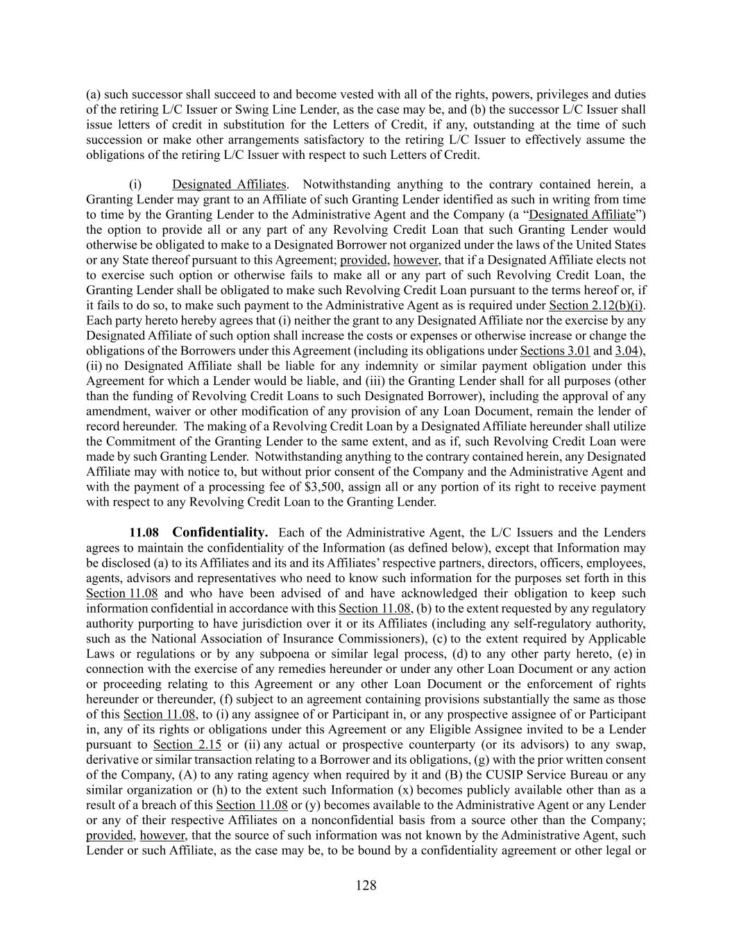 128 (a) such successor shall succeed to and become vested with all of the rights, powers, privileges and duties of the retiring L/C Issuer or Swing Line Lender, as the case may be, and (b) the successor L/C Issuer shall issue letters of credit in substitution for the Letters of Credit, if any, outstanding at the time of such succession or make other arrangements satisfactory to the retiring L/C Issuer to effectively assume the obligations of the retiring L/C Issuer with respect to such Letters of Credit. (i) Designated Affiliates. Notwithstanding anything to the contrary contained herein, a Granting Lender may grant to an Affiliate of such Granting Lender identified as such in writing from time to time by the Granting Lender to the Administrative Agent and the Company (a “Designated Affiliate”) the option to provide all or any part of any Revolving Credit Loan that such Granting Lender would otherwise be obligated to make to a Designated Borrower not organized under the laws of the United States or any State thereof pursuant to this Agreement; provided, however, that if a Designated Affiliate elects not to exercise such option or otherwise fails to make all or any part of such Revolving Credit Loan, the Granting Lender shall be obligated to make such Revolving Credit Loan pursuant to the terms hereof or, if it fails to do so, to make such payment to the Administrative Agent as is required under Section 2.12(b)(i). Each party hereto hereby agrees that (i) neither the grant to any Designated Affiliate nor the exercise by any Designated Affiliate of such option shall increase the costs or expenses or otherwise increase or change the obligations of the Borrowers under this Agreement (including its obligations under Sections 3.01 and 3.04), (ii) no Designated Affiliate shall be liable for any indemnity or similar payment obligation under this Agreement for which a Lender would be liable, and (iii) the Granting Lender shall for all purposes (other than the funding of Revolving Credit Loans to such Designated Borrower), including the approval of any amendment, waiver or other modification of any provision of any Loan Document, remain the lender of record hereunder. The making of a Revolving Credit Loan by a Designated Affiliate hereunder shall utilize the Commitment of the Granting Lender to the same extent, and as if, such Revolving Credit Loan were made by such Granting Lender. Notwithstanding anything to the contrary contained herein, any Designated Affiliate may with notice to, but without prior consent of the Company and the Administrative Agent and with the payment of a processing fee of $3,500, assign all or any portion of its right to receive payment with respect to any Revolving Credit Loan to the Granting Lender. 11.08 Confidentiality. Each of the Administrative Agent, the L/C Issuers and the Lenders agrees to maintain the confidentiality of the Information (as defined below), except that Information may be disclosed (a) to its Affiliates and its and its Affiliates’ respective partners, directors, officers, employees, agents, advisors and representatives who need to know such information for the purposes set forth in this Section 11.08 and who have been advised of and have acknowledged their obligation to keep such information confidential in accordance with this Section 11.08, (b) to the extent requested by any regulatory authority purporting to have jurisdiction over it or its Affiliates (including any self-regulatory authority, such as the National Association of Insurance Commissioners), (c) to the extent required by Applicable Laws or regulations or by any subpoena or similar legal process, (d) to any other party hereto, (e) in connection with the exercise of any remedies hereunder or under any other Loan Document or any action or proceeding relating to this Agreement or any other Loan Document or the enforcement of rights hereunder or thereunder, (f) subject to an agreement containing provisions substantially the same as those of this Section 11.08, to (i) any assignee of or Participant in, or any prospective assignee of or Participant in, any of its rights or obligations under this Agreement or any Eligible Assignee invited to be a Lender pursuant to Section 2.15 or (ii) any actual or prospective counterparty (or its advisors) to any swap, derivative or similar transaction relating to a Borrower and its obligations, (g) with the prior written consent of the Company, (A) to any rating agency when required by it and (B) the CUSIP Service Bureau or any similar organization or (h) to the extent such Information (x) becomes publicly available other than as a result of a breach of this Section 11.08 or (y) becomes available to the Administrative Agent or any Lender or any of their respective Affiliates on a nonconfidential basis from a source other than the Company; provided, however, that the source of such information was not known by the Administrative Agent, such Lender or such Affiliate, as the case may be, to be bound by a confidentiality agreement or other legal or