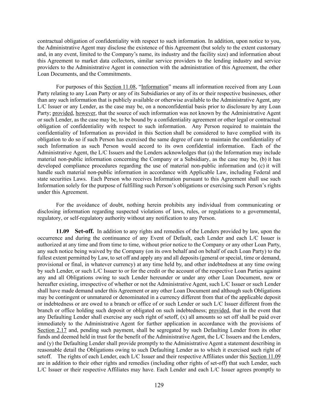 129 contractual obligation of confidentiality with respect to such information. In addition, upon notice to you, the Administrative Agent may disclose the existence of this Agreement (but solely to the extent customary and, in any event, limited to the Company’s name, its industry and the facility size) and information about this Agreement to market data collectors, similar service providers to the lending industry and service providers to the Administrative Agent in connection with the administration of this Agreement, the other Loan Documents, and the Commitments. For purposes of this Section 11.08, “Information” means all information received from any Loan Party relating to any Loan Party or any of its Subsidiaries or any of its or their respective businesses, other than any such information that is publicly available or otherwise available to the Administrative Agent, any L/C Issuer or any Lender, as the case may be, on a nonconfidential basis prior to disclosure by any Loan Party; provided, however, that the source of such information was not known by the Administrative Agent or such Lender, as the case may be, to be bound by a confidentiality agreement or other legal or contractual obligation of confidentiality with respect to such information. Any Person required to maintain the confidentiality of Information as provided in this Section shall be considered to have complied with its obligation to do so if such Person has exercised the same degree of care to maintain the confidentiality of such Information as such Person would accord to its own confidential information. Each of the Administrative Agent, the L/C Issuers and the Lenders acknowledges that (a) the Information may include material non-public information concerning the Company or a Subsidiary, as the case may be, (b) it has developed compliance procedures regarding the use of material non-public information and (c) it will handle such material non-public information in accordance with Applicable Law, including Federal and state securities Laws. Each Person who receives Information pursuant to this Agreement shall use such Information solely for the purpose of fulfilling such Person’s obligations or exercising such Person’s rights under this Agreement. For the avoidance of doubt, nothing herein prohibits any individual from communicating or disclosing information regarding suspected violations of laws, rules, or regulations to a governmental, regulatory, or self-regulatory authority without any notification to any Person. 11.09 Set-off. In addition to any rights and remedies of the Lenders provided by law, upon the occurrence and during the continuance of any Event of Default, each Lender and each L/C Issuer is authorized at any time and from time to time, without prior notice to the Company or any other Loan Party, any such notice being waived by the Company (on its own behalf and on behalf of each Loan Party) to the fullest extent permitted by Law, to set off and apply any and all deposits (general or special, time or demand, provisional or final, in whatever currency) at any time held by, and other indebtedness at any time owing by such Lender, or such L/C Issuer to or for the credit or the account of the respective Loan Parties against any and all Obligations owing to such Lender hereunder or under any other Loan Document, now or hereafter existing, irrespective of whether or not the Administrative Agent, such L/C Issuer or such Lender shall have made demand under this Agreement or any other Loan Document and although such Obligations may be contingent or unmatured or denominated in a currency different from that of the applicable deposit or indebtedness or are owed to a branch or office of or such Lender or such L/C Issuer different from the branch or office holding such deposit or obligated on such indebtedness; provided, that in the event that any Defaulting Lender shall exercise any such right of setoff, (x) all amounts so set off shall be paid over immediately to the Administrative Agent for further application in accordance with the provisions of Section 2.17 and, pending such payment, shall be segregated by such Defaulting Lender from its other funds and deemed held in trust for the benefit of the Administrative Agent, the L/C Issuers and the Lenders, and (y) the Defaulting Lender shall provide promptly to the Administrative Agent a statement describing in reasonable detail the Obligations owing to such Defaulting Lender as to which it exercised such right of setoff. The rights of each Lender, each L/C Issuer and their respective Affiliates under this Section 11.09 are in addition to their other rights and remedies (including other rights of set-off) that such Lender, such L/C Issuer or their respective Affiliates may have. Each Lender and each L/C Issuer agrees promptly to