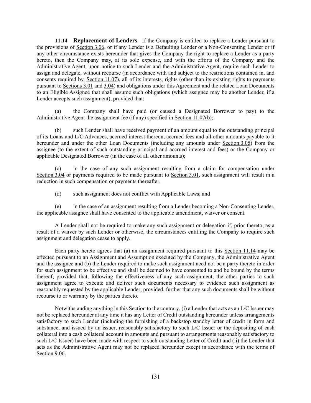 131 11.14 Replacement of Lenders. If the Company is entitled to replace a Lender pursuant to the provisions of Section 3.06, or if any Lender is a Defaulting Lender or a Non-Consenting Lender or if any other circumstance exists hereunder that gives the Company the right to replace a Lender as a party hereto, then the Company may, at its sole expense, and with the efforts of the Company and the Administrative Agent, upon notice to such Lender and the Administrative Agent, require such Lender to assign and delegate, without recourse (in accordance with and subject to the restrictions contained in, and consents required by, Section 11.07), all of its interests, rights (other than its existing rights to payments pursuant to Sections 3.01 and 3.04) and obligations under this Agreement and the related Loan Documents to an Eligible Assignee that shall assume such obligations (which assignee may be another Lender, if a Lender accepts such assignment), provided that: (a) the Company shall have paid (or caused a Designated Borrower to pay) to the Administrative Agent the assignment fee (if any) specified in Section 11.07(b); (b) such Lender shall have received payment of an amount equal to the outstanding principal of its Loans and L/C Advances, accrued interest thereon, accrued fees and all other amounts payable to it hereunder and under the other Loan Documents (including any amounts under Section 3.05) from the assignee (to the extent of such outstanding principal and accrued interest and fees) or the Company or applicable Designated Borrower (in the case of all other amounts); (c) in the case of any such assignment resulting from a claim for compensation under Section 3.04 or payments required to be made pursuant to Section 3.01, such assignment will result in a reduction in such compensation or payments thereafter; (d) such assignment does not conflict with Applicable Laws; and (e) in the case of an assignment resulting from a Lender becoming a Non-Consenting Lender, the applicable assignee shall have consented to the applicable amendment, waiver or consent. A Lender shall not be required to make any such assignment or delegation if, prior thereto, as a result of a waiver by such Lender or otherwise, the circumstances entitling the Company to require such assignment and delegation cease to apply. Each party hereto agrees that (a) an assignment required pursuant to this Section 11.14 may be effected pursuant to an Assignment and Assumption executed by the Company, the Administrative Agent and the assignee and (b) the Lender required to make such assignment need not be a party thereto in order for such assignment to be effective and shall be deemed to have consented to and be bound by the terms thereof; provided that, following the effectiveness of any such assignment, the other parties to such assignment agree to execute and deliver such documents necessary to evidence such assignment as reasonably requested by the applicable Lender; provided, further that any such documents shall be without recourse to or warranty by the parties thereto. Notwithstanding anything in this Section to the contrary, (i) a Lender that acts as an L/C Issuer may not be replaced hereunder at any time it has any Letter of Credit outstanding hereunder unless arrangements satisfactory to such Lender (including the furnishing of a backstop standby letter of credit in form and substance, and issued by an issuer, reasonably satisfactory to such L/C Issuer or the depositing of cash collateral into a cash collateral account in amounts and pursuant to arrangements reasonably satisfactory to such L/C Issuer) have been made with respect to such outstanding Letter of Credit and (ii) the Lender that acts as the Administrative Agent may not be replaced hereunder except in accordance with the terms of Section 9.06.