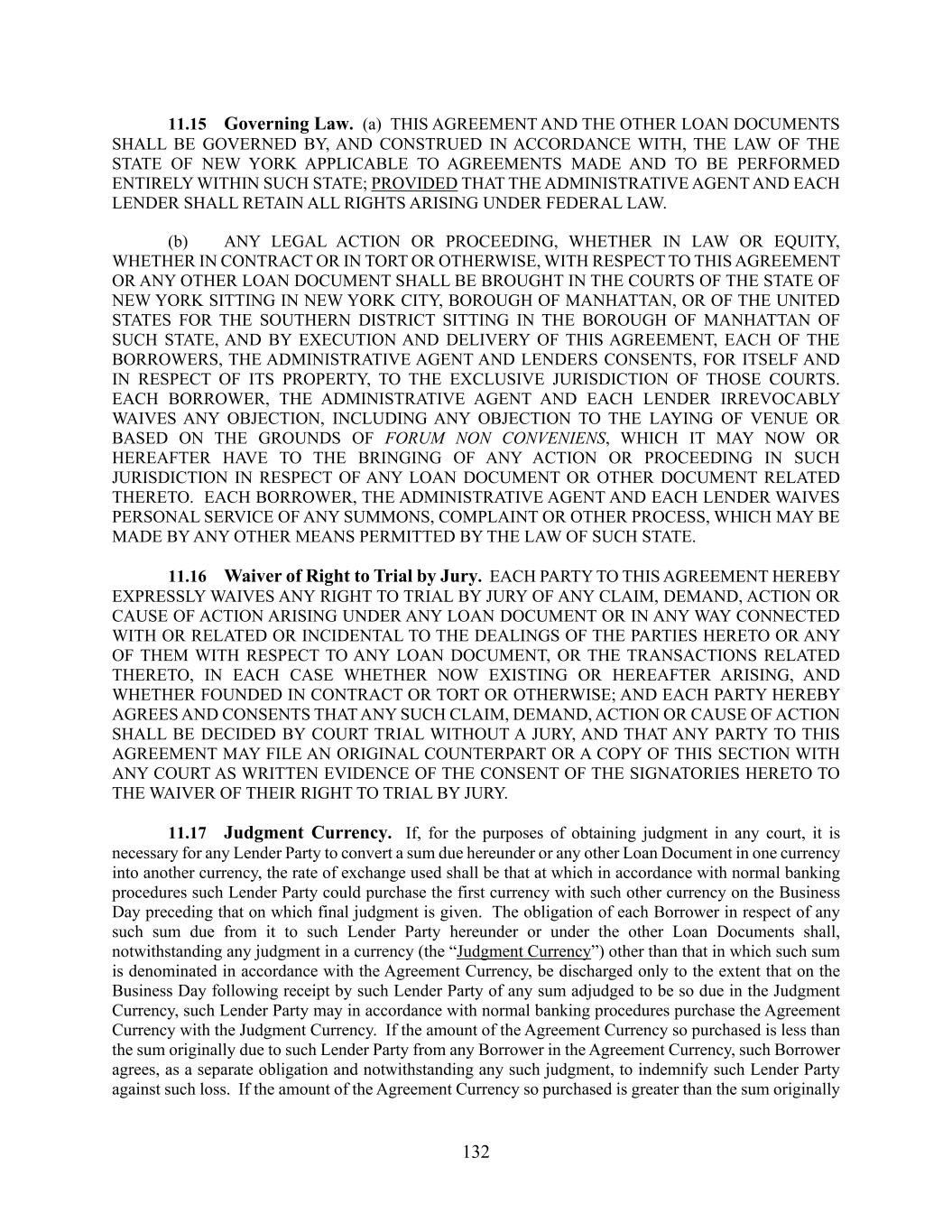 132 11.15 Governing Law. (a) THIS AGREEMENT AND THE OTHER LOAN DOCUMENTS SHALL BE GOVERNED BY, AND CONSTRUED IN ACCORDANCE WITH, THE LAW OF THE STATE OF NEW YORK APPLICABLE TO AGREEMENTS MADE AND TO BE PERFORMED ENTIRELY WITHIN SUCH STATE; PROVIDED THAT THE ADMINISTRATIVE AGENT AND EACH LENDER SHALL RETAIN ALL RIGHTS ARISING UNDER FEDERAL LAW. (b) ANY LEGAL ACTION OR PROCEEDING, WHETHER IN LAW OR EQUITY, WHETHER IN CONTRACT OR IN TORT OR OTHERWISE, WITH RESPECT TO THIS AGREEMENT OR ANY OTHER LOAN DOCUMENT SHALL BE BROUGHT IN THE COURTS OF THE STATE OF NEW YORK SITTING IN NEW YORK CITY, BOROUGH OF MANHATTAN, OR OF THE UNITED STATES FOR THE SOUTHERN DISTRICT SITTING IN THE BOROUGH OF MANHATTAN OF SUCH STATE, AND BY EXECUTION AND DELIVERY OF THIS AGREEMENT, EACH OF THE BORROWERS, THE ADMINISTRATIVE AGENT AND LENDERS CONSENTS, FOR ITSELF AND IN RESPECT OF ITS PROPERTY, TO THE EXCLUSIVE JURISDICTION OF THOSE COURTS. EACH BORROWER, THE ADMINISTRATIVE AGENT AND EACH LENDER IRREVOCABLY WAIVES ANY OBJECTION, INCLUDING ANY OBJECTION TO THE LAYING OF VENUE OR BASED ON THE GROUNDS OF FORUM NON CONVENIENS, WHICH IT MAY NOW OR HEREAFTER HAVE TO THE BRINGING OF ANY ACTION OR PROCEEDING IN SUCH JURISDICTION IN RESPECT OF ANY LOAN DOCUMENT OR OTHER DOCUMENT RELATED THERETO. EACH BORROWER, THE ADMINISTRATIVE AGENT AND EACH LENDER WAIVES PERSONAL SERVICE OF ANY SUMMONS, COMPLAINT OR OTHER PROCESS, WHICH MAY BE MADE BY ANY OTHER MEANS PERMITTED BY THE LAW OF SUCH STATE. 11.16 Waiver of Right to Trial by Jury. EACH PARTY TO THIS AGREEMENT HEREBY EXPRESSLY WAIVES ANY RIGHT TO TRIAL BY JURY OF ANY CLAIM, DEMAND, ACTION OR CAUSE OF ACTION ARISING UNDER ANY LOAN DOCUMENT OR IN ANY WAY CONNECTED WITH OR RELATED OR INCIDENTAL TO THE DEALINGS OF THE PARTIES HERETO OR ANY OF THEM WITH RESPECT TO ANY LOAN DOCUMENT, OR THE TRANSACTIONS RELATED THERETO, IN EACH CASE WHETHER NOW EXISTING OR HEREAFTER ARISING, AND WHETHER FOUNDED IN CONTRACT OR TORT OR OTHERWISE; AND EACH PARTY HEREBY AGREES AND CONSENTS THAT ANY SUCH CLAIM, DEMAND, ACTION OR CAUSE OF ACTION SHALL BE DECIDED BY COURT TRIAL WITHOUT A JURY, AND THAT ANY PARTY TO THIS AGREEMENT MAY FILE AN ORIGINAL COUNTERPART OR A COPY OF THIS SECTION WITH ANY COURT AS WRITTEN EVIDENCE OF THE CONSENT OF THE SIGNATORIES HERETO TO THE WAIVER OF THEIR RIGHT TO TRIAL BY JURY. 11.17 Judgment Currency. If, for the purposes of obtaining judgment in any court, it is necessary for any Lender Party to convert a sum due hereunder or any other Loan Document in one currency into another currency, the rate of exchange used shall be that at which in accordance with normal banking procedures such Lender Party could purchase the first currency with such other currency on the Business Day preceding that on which final judgment is given. The obligation of each Borrower in respect of any such sum due from it to such Lender Party hereunder or under the other Loan Documents shall, notwithstanding any judgment in a currency (the “Judgment Currency”) other than that in which such sum is denominated in accordance with the Agreement Currency, be discharged only to the extent that on the Business Day following receipt by such Lender Party of any sum adjudged to be so due in the Judgment Currency, such Lender Party may in accordance with normal banking procedures purchase the Agreement Currency with the Judgment Currency. If the amount of the Agreement Currency so purchased is less than the sum originally due to such Lender Party from any Borrower in the Agreement Currency, such Borrower agrees, as a separate obligation and notwithstanding any such judgment, to indemnify such Lender Party against such loss. If the amount of the Agreement Currency so purchased is greater than the sum originally