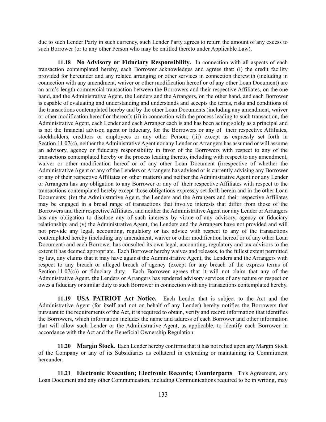 133 due to such Lender Party in such currency, such Lender Party agrees to return the amount of any excess to such Borrower (or to any other Person who may be entitled thereto under Applicable Law). 11.18 No Advisory or Fiduciary Responsibility. In connection with all aspects of each transaction contemplated hereby, each Borrower acknowledges and agrees that: (i) the credit facility provided for hereunder and any related arranging or other services in connection therewith (including in connection with any amendment, waiver or other modification hereof or of any other Loan Document) are an arm’s-length commercial transaction between the Borrowers and their respective Affiliates, on the one hand, and the Administrative Agent, the Lenders and the Arrangers, on the other hand, and each Borrower is capable of evaluating and understanding and understands and accepts the terms, risks and conditions of the transactions contemplated hereby and by the other Loan Documents (including any amendment, waiver or other modification hereof or thereof); (ii) in connection with the process leading to such transaction, the Administrative Agent, each Lender and each Arranger each is and has been acting solely as a principal and is not the financial advisor, agent or fiduciary, for the Borrowers or any of their respective Affiliates, stockholders, creditors or employees or any other Person; (iii) except as expressly set forth in Section 11.07(c), neither the Administrative Agent nor any Lender or Arrangers has assumed or will assume an advisory, agency or fiduciary responsibility in favor of the Borrowers with respect to any of the transactions contemplated hereby or the process leading thereto, including with respect to any amendment, waiver or other modification hereof or of any other Loan Document (irrespective of whether the Administrative Agent or any of the Lenders or Arrangers has advised or is currently advising any Borrower or any of their respective Affiliates on other matters) and neither the Administrative Agent nor any Lender or Arrangers has any obligation to any Borrower or any of their respective Affiliates with respect to the transactions contemplated hereby except those obligations expressly set forth herein and in the other Loan Documents; (iv) the Administrative Agent, the Lenders and the Arrangers and their respective Affiliates may be engaged in a broad range of transactions that involve interests that differ from those of the Borrowers and their respective Affiliates, and neither the Administrative Agent nor any Lender or Arrangers has any obligation to disclose any of such interests by virtue of any advisory, agency or fiduciary relationship; and (v) the Administrative Agent, the Lenders and the Arrangers have not provided and will not provide any legal, accounting, regulatory or tax advice with respect to any of the transactions contemplated hereby (including any amendment, waiver or other modification hereof or of any other Loan Document) and each Borrower has consulted its own legal, accounting, regulatory and tax advisors to the extent it has deemed appropriate. Each Borrower hereby waives and releases, to the fullest extent permitted by law, any claims that it may have against the Administrative Agent, the Lenders and the Arrangers with respect to any breach or alleged breach of agency (except for any breach of the express terms of Section 11.07(c)) or fiduciary duty. Each Borrower agrees that it will not claim that any of the Administrative Agent, the Lenders or Arrangers has rendered advisory services of any nature or respect or owes a fiduciary or similar duty to such Borrower in connection with any transactions contemplated hereby. 11.19 USA PATRIOT Act Notice. Each Lender that is subject to the Act and the Administrative Agent (for itself and not on behalf of any Lender) hereby notifies the Borrowers that pursuant to the requirements of the Act, it is required to obtain, verify and record information that identifies the Borrowers, which information includes the name and address of each Borrower and other information that will allow such Lender or the Administrative Agent, as applicable, to identify each Borrower in accordance with the Act and the Beneficial Ownership Regulation. 11.20 Margin Stock. Each Lender hereby confirms that it has not relied upon any Margin Stock of the Company or any of its Subsidiaries as collateral in extending or maintaining its Commitment hereunder. 11.21 Electronic Execution; Electronic Records; Counterparts. This Agreement, any Loan Document and any other Communication, including Communications required to be in writing, may
