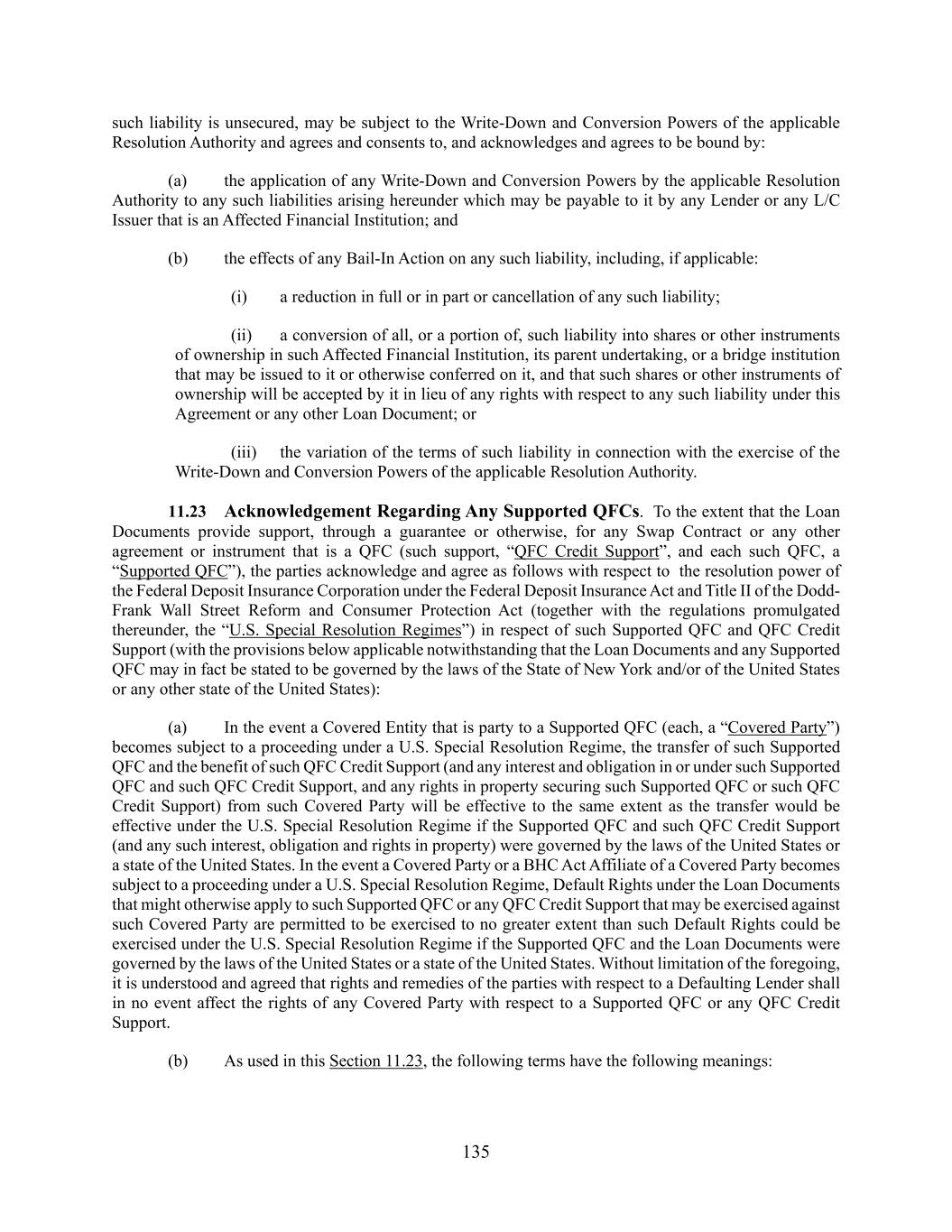 135 such liability is unsecured, may be subject to the Write-Down and Conversion Powers of the applicable Resolution Authority and agrees and consents to, and acknowledges and agrees to be bound by: (a) the application of any Write-Down and Conversion Powers by the applicable Resolution Authority to any such liabilities arising hereunder which may be payable to it by any Lender or any L/C Issuer that is an Affected Financial Institution; and (b) the effects of any Bail-In Action on any such liability, including, if applicable: (i) a reduction in full or in part or cancellation of any such liability; (ii) a conversion of all, or a portion of, such liability into shares or other instruments of ownership in such Affected Financial Institution, its parent undertaking, or a bridge institution that may be issued to it or otherwise conferred on it, and that such shares or other instruments of ownership will be accepted by it in lieu of any rights with respect to any such liability under this Agreement or any other Loan Document; or (iii) the variation of the terms of such liability in connection with the exercise of the Write-Down and Conversion Powers of the applicable Resolution Authority. 11.23 Acknowledgement Regarding Any Supported QFCs. To the extent that the Loan Documents provide support, through a guarantee or otherwise, for any Swap Contract or any other agreement or instrument that is a QFC (such support, “QFC Credit Support”, and each such QFC, a “Supported QFC”), the parties acknowledge and agree as follows with respect to the resolution power of the Federal Deposit Insurance Corporation under the Federal Deposit Insurance Act and Title II of the Dodd- Frank Wall Street Reform and Consumer Protection Act (together with the regulations promulgated thereunder, the “U.S. Special Resolution Regimes”) in respect of such Supported QFC and QFC Credit Support (with the provisions below applicable notwithstanding that the Loan Documents and any Supported QFC may in fact be stated to be governed by the laws of the State of New York and/or of the United States or any other state of the United States): (a) In the event a Covered Entity that is party to a Supported QFC (each, a “Covered Party”) becomes subject to a proceeding under a U.S. Special Resolution Regime, the transfer of such Supported QFC and the benefit of such QFC Credit Support (and any interest and obligation in or under such Supported QFC and such QFC Credit Support, and any rights in property securing such Supported QFC or such QFC Credit Support) from such Covered Party will be effective to the same extent as the transfer would be effective under the U.S. Special Resolution Regime if the Supported QFC and such QFC Credit Support (and any such interest, obligation and rights in property) were governed by the laws of the United States or a state of the United States. In the event a Covered Party or a BHC Act Affiliate of a Covered Party becomes subject to a proceeding under a U.S. Special Resolution Regime, Default Rights under the Loan Documents that might otherwise apply to such Supported QFC or any QFC Credit Support that may be exercised against such Covered Party are permitted to be exercised to no greater extent than such Default Rights could be exercised under the U.S. Special Resolution Regime if the Supported QFC and the Loan Documents were governed by the laws of the United States or a state of the United States. Without limitation of the foregoing, it is understood and agreed that rights and remedies of the parties with respect to a Defaulting Lender shall in no event affect the rights of any Covered Party with respect to a Supported QFC or any QFC Credit Support. (b) As used in this Section 11.23, the following terms have the following meanings: