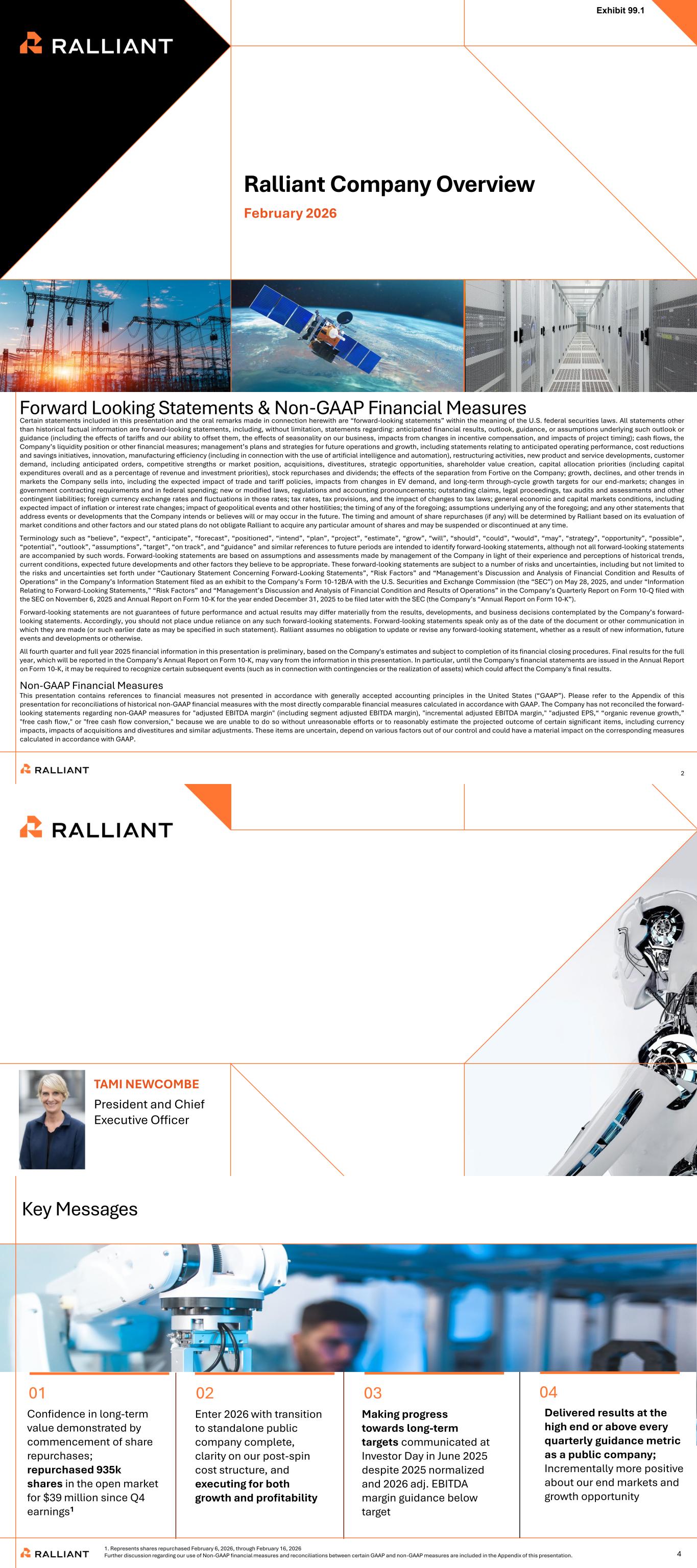 2025 INVESTOR DAY Ralliant Company Overview February 2026 1 Exhibit 99.1 Forward Looking Statements & Non-GAAP Financial Measures 22 Certain statements included in this presentation and the oral remarks made in connection herewith are “forward-looking statements” within the meaning of the U.S. federal securities laws. All statements other than historical factual information are forward-looking statements, including, without limitation, statements regarding: anticipated financial results, outlook, guidance, or assumptions underlying such outlook or guidance (including the effects of tariffs and our ability to offset them, the effects of seasonality on our business, impacts from changes in incentive compensation, and impacts of project timing); cash flows, the Company’s liquidity position or other financial measures; management’s plans and strategies for future operations and growth, including statements relating to anticipated operating performance, cost reductions and savings initiatives, innovation, manufacturing efficiency (including in connection with the use of artificial intelligence and automation), restructuring activities, new product and service developments, customer demand, including anticipated orders, competitive strengths or market position, acquisitions, divestitures, strategic opportunities, shareholder value creation, capital allocation priorities (including capital expenditures overall and as a percentage of revenue and investment priorities), stock repurchases and dividends; the effects of the separation from Fortive on the Company; growth, declines, and other trends in markets the Company sells into, including the expected impact of trade and tariff policies, impacts from changes in EV demand, and long-term through-cycle growth targets for our end-markets; changes in government contracting requirements and in federal spending; new or modified laws, regulations and accounting pronouncements; outstanding claims, legal proceedings, tax audits and assessments and other contingent liabilities; foreign currency exchange rates and fluctuations in those rates; tax rates, tax provisions, and the impact of changes to tax laws; general economic and capital markets conditions, including expected impact of inflation or interest rate changes; impact of geopolitical events and other hostilities; the timing of any of the foregoing; assumptions underlying any of the foregoing; and any other statements that address events or developments that the Company intends or believes will or may occur in the future. The timing and amount of share repurchases (if any) will be determined by Ralliant based on its evaluation of market conditions and other factors and our stated plans do not obligate Ralliant to acquire any particular amount of shares and may be suspended or discontinued at any time. Terminology such as “believe”, “expect”, “anticipate”, “forecast”, “positioned”, “intend”, “plan”, “project”, “estimate”, “grow”, “will”, “should”, “could”, “would”, “may”, “strategy”, “opportunity”, “possible”, “potential”, “outlook”, “assumptions”, “target”, “on track”, and “guidance” and similar references to future periods are intended to identify forward-looking statements, although not all forward-looking statements are accompanied by such words. Forward-looking statements are based on assumptions and assessments made by management of the Company in light of their experience and perceptions of historical trends, current conditions, expected future developments and other factors they believe to be appropriate. These forward-looking statements are subject to a number of risks and uncertainties, including but not limited to the risks and uncertainties set forth under “Cautionary Statement Concerning Forward-Looking Statements”, “Risk Factors” and “Management’s Discussion and Analysis of Financial Condition and Results of Operations” in the Company’s Information Statement filed as an exhibit to the Company’s Form 10-12B/A with the U.S. Securities and Exchange Commission (the “SEC”) on May 28, 2025, and under “Information Relating to Forward-Looking Statements,” “Risk Factors” and “Management’s Discussion and Analysis of Financial Condition and Results of Operations” in the Company’s Quarterly Report on Form 10-Q filed with the SEC on November 6, 2025 and Annual Report on Form 10-K for the year ended December 31, 2025 to be filed later with the SEC (the Company’s “Annual Report on Form 10-K”). Forward-looking statements are not guarantees of future performance and actual results may differ materially from the results, developments, and business decisions contemplated by the Company’s forward- looking statements. Accordingly, you should not place undue reliance on any such forward-looking statements. Forward-looking statements speak only as of the date of the document or other communication in which they are made (or such earlier date as may be specified in such statement). Ralliant assumes no obligation to update or revise any forward-looking statement, whether as a result of new information, future events and developments or otherwise. All fourth quarter and full year 2025 financial information in this presentation is preliminary, based on the Company's estimates and subject to completion of its financial closing procedures. Final results for the full year, which will be reported in the Company’s Annual Report on Form 10-K, may vary from the information in this presentation. In particular, until the Company's financial statements are issued in the Annual Report on Form 10-K, it may be required to recognize certain subsequent events (such as in connection with contingencies or the realization of assets) which could affect the Company's final results. This presentation contains references to financial measures not presented in accordance with generally ac