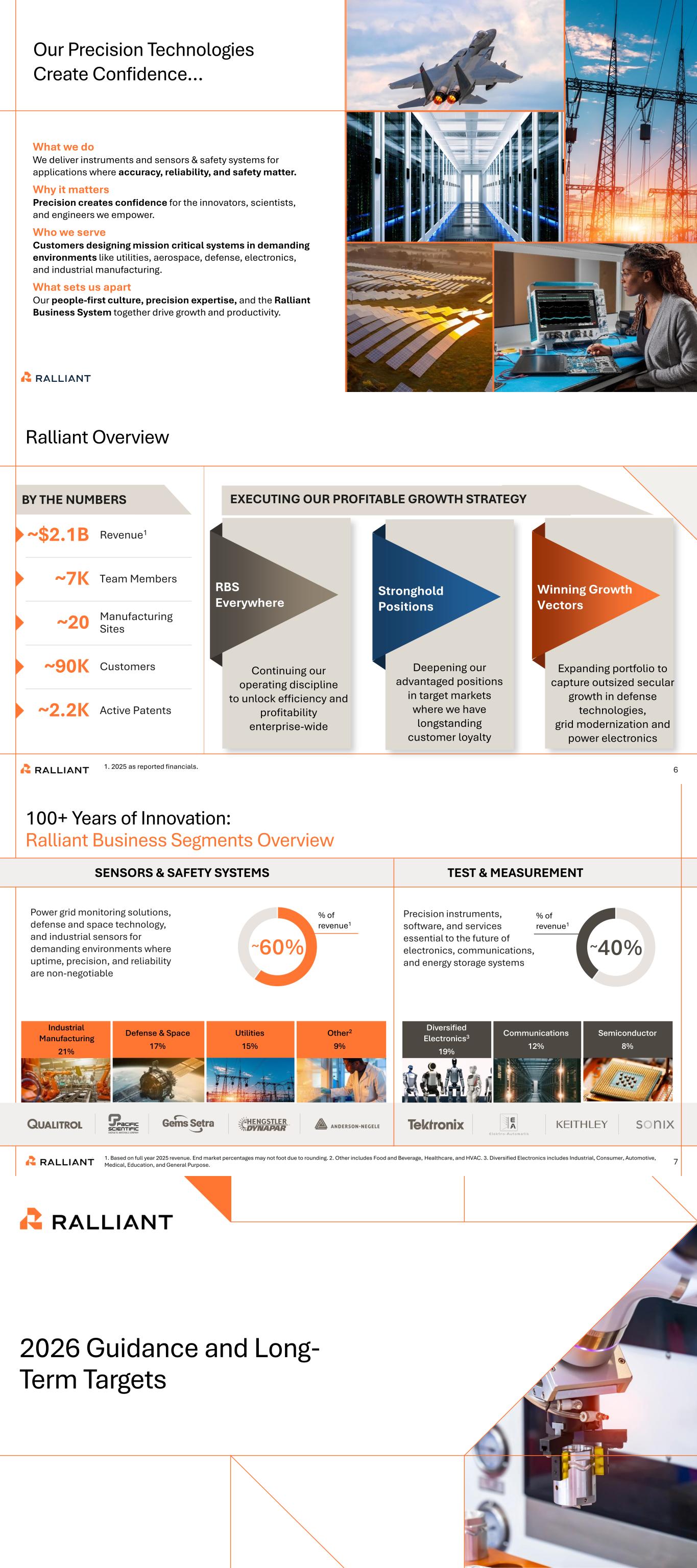 5 Our Precision Technologies Create Confidence… ALT OPTION What we do We deliver instruments and sensors & safety systems for applications where accuracy, reliability, and safety matter. Why it matters Precision creates confidence for the innovators, scientists, and engineers we empower. Who we serve Customers designing mission critical systems in demanding environments like utilities, aerospace, defense, electronics, and industrial manufacturing. What sets us apart Our people-first culture, precision expertise, and the Ralliant Business System together drive growth and productivity. BY THE NUMBERS ~7K Team Members ~20 Manufacturing Sites ~90K Customers ~2.2K Active Patents ~$2.1B Revenue1 6 Ralliant Overview 1. 2025 as reported financials. RBS Everywhere Continuing our operating discipline to unlock efficiency and profitability enterprise-wide Winning Growth Vectors Expanding portfolio to capture outsized secular growth in defense technologies, grid modernization and power electronics Stronghold Positions Deepening our advantaged positions in target markets where we have longstanding customer loyalty EXECUTING OUR PROFITABLE GROWTH STRATEGY 7 100+ Years of Innovation: Ralliant Business Segments Overview Power grid monitoring solutions, defense and space technology, and industrial sensors for demanding environments where uptime, precision, and reliability are non-negotiable Precision instruments, software, and services essential to the future of electronics, communications, and energy storage systems SENSORS & SAFETY SYSTEMS ~60% % of revenue1 TEST & MEASUREMENT Defense & Space 17% Semiconductor 8% Industrial Manufacturing 21% Utilities 15% Diversified Electronics3 19% Communications 12% ~40% % of revenue1 • 1. Based on full year 2025 revenue. End market percentages may not foot due to rounding. 2. Other includes Food and Beverage, Healthcare, and HVAC. 3. Diversified Electronics includes Industrial, Consumer, Automotive, Medical, Education, and General Purpose. Other2 9% 2025 INVESTOR DAY 2026 Guidance and Long- Term Targets