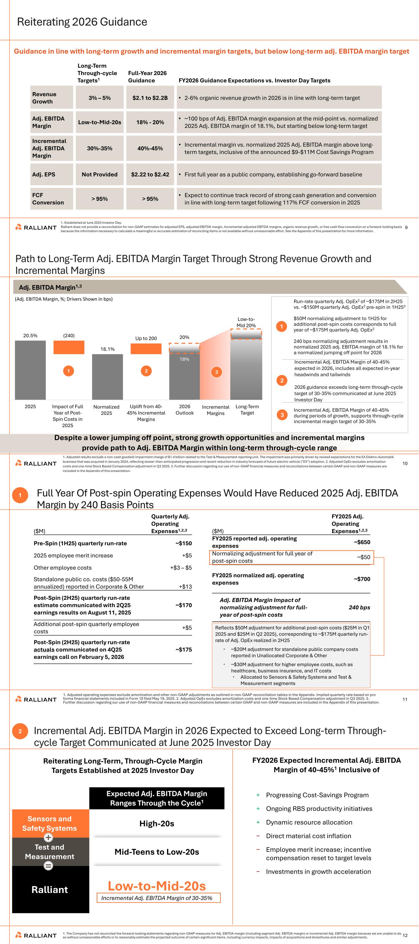 9 Reiterating 2026 Guidance 1. Established at June 2025 Investor Day. Ralliant does not provide a reconciliation for non-GAAP estimates for adjusted EPS, adjusted EBITDA margin, Incremental adjusted EBITDA margins, organic revenue growth, or free cash flow conversion on a forward-looking basis because the information necessary to calculate a meaningful or accurate estimation of reconciling items is not available without unreasonable effort. See the Appendix of this presentation for more information. Guidance in line with long-term growth and incremental margin targets, but below long-term adj. EBITDA margin target Long-Term Through-cycle Targets1 Full-Year 2026 Guidance FY2026 Guidance Expectations vs. Investor Day Targets Revenue Growth 3% – 5% $2.1 to $2.2B • 2-6% organic revenue growth in 2026 is in line with long-term target Adj. EBITDA Margin Low-to-Mid-20s 18% - 20% • ~100 bps of Adj. EBITDA margin expansion at the mid-point vs. normalized 2025 Adj. EBITDA margin of 18.1%, but starting below long-term target Incremental Adj. EBITDA Margin 30%-35% 40%-45% • Incremental margin vs. normalized 2025 Adj. EBITDA margin above long- term targets, inclusive of the announced $9-$11M Cost Savings Program Adj. EPS Not Provided $2.22 to $2.42 • First full year as a public company, establishing go-forward baseline FCF Conversion > 95% > 95% • Expect to continue track record of strong cash generation and conversion in line with long-term target following 117% FCF conversion in 2025 20.5% (240) 18.1% Up to 200 2025 Lapping Pre-Spin Costs in 1H'26 Pro Forma 2025 Uplift from 40- 45% Incremental Margins 2026 Outlook Im act of Full Year of Post- Spin Costs in 2025 Normalized 2025 10 Path to Long-Term Adj. EBITDA Margin Target Through Strong Revenue Growth and Incremental Margins 1. Adjusted results exclude a non-cash goodwill impairment charge of $1.4 billion related to the Test & Measurement reporting unit. The impairment was primarily driven by revised expectations for the EA Elektro-Automatik business that was acquired in January 2024, reflecting slower-than-anticipated progression and recent reduction in industry forecasts of future electric vehicle (“EV”) adoption. 2. Adjusted OpEx excludes amortization costs and one-time Stock Based Compensation adjustment in Q3 2025. 3. Further discussion regarding our use of non-GAAP financial measures and reconciliations between certain GAAP and non-GAAP measures are included in the Appendix of this presentation. Adj. EBITDA Margin1,3 18% 20% (Adj. EBITDA Margin, %; Drivers Shown in bps) 1 2 3 Run-rate quarterly Adj. OpEx2 of ~$175M in 2H25 vs. ~$150M quarterly Adj. OpEx2 pre-spin in 1H253 $50M normalizing adjustment to 1H25 for additional post-spin costs corresponds to full year of ~$175M quarterly Adj. OpEx2 240 bps normalizing adjustment results in normalized 2025 adj. EBITDA margin of 18.1% for a normalized jumping off point for 2026 Incremental Adj. EBITDA Margin of 40-45% expected in 2026, includes all expected in-year headwinds and tailwinds 2026 guidance exceeds long-term through-cycle target of 30-35% communicated at June 2025 Investor Day 1 2 3 Despite a lower jumping off point, strong growth opportunities and incremental margins provide path to Adj. EBITDA Margin within long-term through-cycle range Incremental Adj. EBITDA Margin of 40-45% during periods of growth, supports through-cycle incremental margin target of 30-35% Low-to- Mid 20% Long-Term Target Incremental Margins 11 Full Year Of Post-spin Operating Expenses Would Have Reduced 2025 Adj. EBITDA Margin by 240 Basis Points Reflects $50M adjustment for additional post-spin costs ($25M in Q1 2025 and $25M in Q2 2025), corresponding to ~$175M quarterly run- rate of Adj. OpEx realized in 2H25 • ~$20M adjustment for standalone public company costs reported in Unallocated Corporate & Other • ~$30M adjustment for higher employee costs, such as healthcare, business insurance, and IT costs • Allocated to Sensors & Safety Systems and Test & Measurement segments ($M) Quarterly Adj. Operating Expenses1,2,3 Pre-Spin (1H25) quarterly run-rate ~$150 2025 employee merit increase +$5 Other employee costs +$3 – $5 Standalone public co. costs ($50-55M annualized) reported in Corporate & Other +$13 Post-Spin (2H25) quarterly run-rate estimate communicated with 2Q25 earnings results on August 11, 2025 ~$170 Additional post-spin quarterly employee costs +$5 Post-Spin (2H25) quarterly run-rate actuals communicated on 4Q25 earnings call on February 5, 2026 ~$175 1. Adjusted operating expenses exclude amortization and other non-GAAP adjustments as outlined in non-GAAP reconciliation tables in the Appendix. Implied quarterly rate based on pro forma financial statements included in Form 10 filed May 19, 2025. 2. Adjusted OpEx excludes amortization costs and one-time Stock Based Compensation adjustment in Q3 2025. 3. Further discussion regarding our use of non-GAAP financial measures and reconciliations between certain GAAP and non-GAAP measures are included in the Appendix of this presentation. ($M) FY2025 Adj. Operating Expenses1,2,3 FY2025 reported adj. operating expenses ~$650 Normalizing adjustment for full year of post-spin costs ~$50 FY2025 normalized adj. operating expenses ~$700 Adj. EBITDA Margin Impact of normalizing adjustment for full- year of post-spin costs 240 bps 1 12 Incremental Adj. EBITDA Margin in 2026 Expected to Exceed Long-term Through- cycle Target Communicated at June 2025 Investor Day 1. The Company has not reconciled the forward-looking statements regarding non-GAAP measures for Adj. EBITDA margin (including segment Adj. EBITDA margin) or incremental Adj. EBITDA margin because we are unable to do so without unreasonable efforts or to reasonably estimate the projected outcome of certain significant items, including currency impacts, impacts of acquisitions and divestitures and similar adjustments. FY2026 Expected Incremental Adj. EBITDA Margin of 40-45%1 Inclusive of 