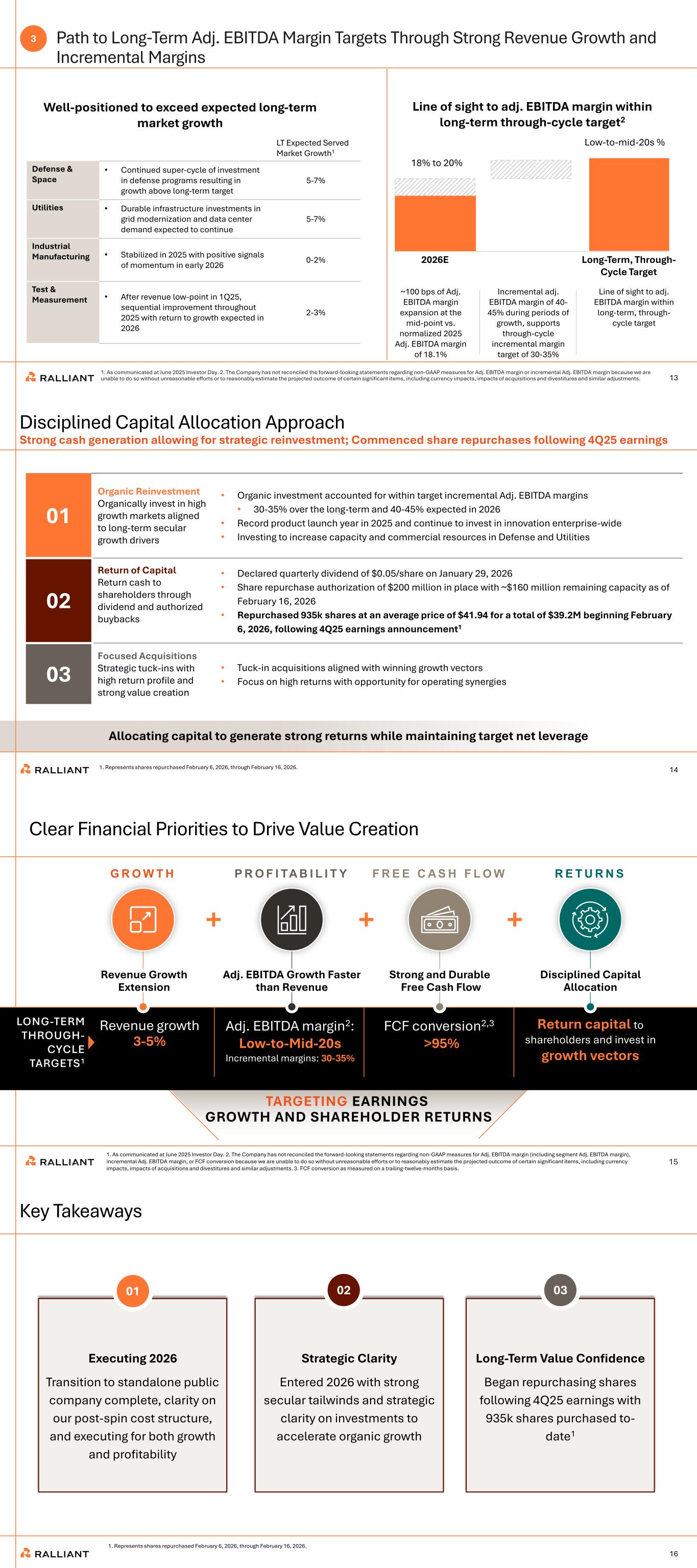 13 Path to Long-Term Adj. EBITDA Margin Targets Through Strong Revenue Growth and Incremental Margins 1. As communicated at June 2025 Investor Day. 2. The Company has not reconciled the forward-looking statements regarding non-GAAP measures for Adj. EBITDA margin or incremental Adj. EBITDA margin because we are unable to do so without unreasonable efforts or to reasonably estimate the projected outcome of certain significant items, including currency impacts, impacts of acquisitions and divestitures and similar adjustments. 18% to 20% Low-to-mid-20s % 2026E Well-positioned to exceed expected long-term market growth Long-Term, Through- Cycle Target Line of sight to adj. EBITDA margin within long-term through-cycle target2 LT Expected Served Market Growth1 Defense & Space • Continued super-cycle of investment in defense programs resulting in growth above long-term target 5-7% Utilities • Durable infrastructure investments in grid modernization and data center demand expected to continue 5-7% Industrial Manufacturing • Stabilized in 2025 with positive signals of momentum in early 2026 0-2% Test & Measurement • After revenue low-point in 1Q25, sequential improvement throughout 2025 with return to growth expected in 2026 2-3% Line of sight to adj. EBITDA margin within long-term, through- cycle target Incremental adj. EBITDA margin of 40- 45% during periods of growth, supports through-cycle incremental margin target of 30-35% ~100 bps of Adj. EBITDA margin expansion at the mid-point vs. normalized 2025 Adj. EBITDA margin of 18.1% 3 14 Strong cash generation allowing for strategic reinvestment; Commenced share repurchases following 4Q25 earnings Disciplined Capital Allocation Approach Allocating capital to generate strong returns while maintaining target net leverage 01 Organic Reinvestment Organically invest in high growth markets aligned to long-term secular growth drivers • Organic investment accounted for within target incremental Adj. EBITDA margins • 30-35% over the long-term and 40-45% expected in 2026 • Record product launch year in 2025 and continue to invest in innovation enterprise-wide • Investing to increase capacity and commercial resources in Defense and Utilities 02 Return of Capital Return cash to shareholders through dividend and authorized buybacks • Declared quarterly dividend of $0.05/share on January 29, 2026 • Share repurchase authorization of $200 million in place with ~$160 million remaining capacity as of February 16, 2026 • Repurchased 935k shares at an average price of $41.94 for a total of $39.2M beginning February 6, 2026, following 4Q25 earnings announcement1 03 Focused Acquisitions Strategic tuck-ins with high return profile and strong value creation • Tuck-in acquisitions aligned with winning growth vectors • Focus on high returns with opportunity for operating synergies 1. Represents shares repurchased February 6, 2026, through February 16, 2026. 15 Clear Financial Priorities to Drive Value Creation TARGETING EARNINGS GROWTH AND SHAREHOLDER RETURNS R E T U R N S Return capital to shareholders and invest in growth vectors Disciplined Capital Allocation F R E E C A S H F L O W FCF conversion2,3 >95% Strong and Durable Free Cash Flow P R O F I TA B I L I T Y Adj. EBITDA margin2: Low-to-Mid-20s Incremental margins: 30-35% Adj. EBITDA Growth Faster than Revenue Revenue growth 3-5% G R O W T H LONG-TERM THROUGH- CYCLE TARGETS1 Revenue Growth Extension 1. As communicated at June 2025 Investor Day. 2. The Company has not reconciled the forward-looking statements regarding non-GAAP measures for Adj. EBITDA margin (including segment Adj. EBITDA margin), incremental Adj. EBITDA margin, or FCF conversion because we are unable to do so without unreasonable efforts or to reasonably estimate the projected outcome of certain significant items, including currency impacts, impacts of acquisitions and divestitures and similar adjustments. 3. FCF conversion as measured on a trailing-twelve-months basis. Long-Term Value Confidence Began repurchasing shares following 4Q25 earnings with 935k shares purchased to- date1 Executing 2026 Transition to standalone public company complete, clarity on our post-spin cost structure, and executing for both growth and profitability 16 Key Takeaways Strategic Clarity Entered 2026 with strong secular tailwinds and strategic clarity on investments to accelerate organic growth 01 02 03 1. Represents shares repurchased February 6, 2026, through February 16, 2026.