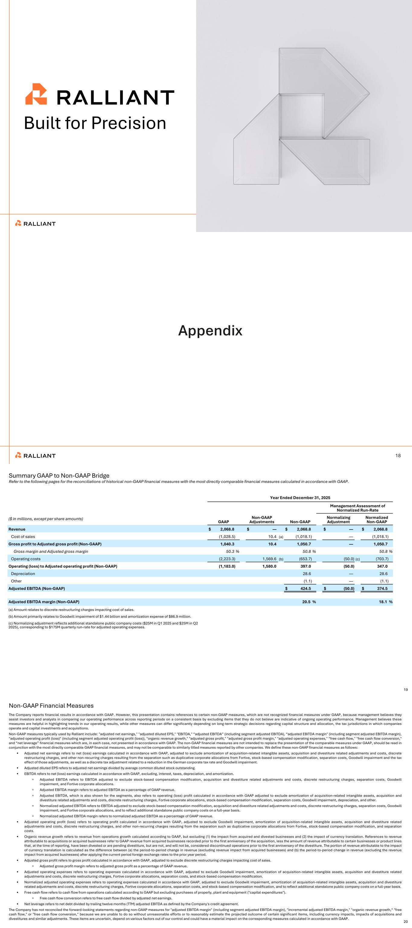 Built for Precision Appendix 18 Summary GAAP to Non-GAAP Bridge Year Ended December 31, 2025 Management Assessment of Normalized Run-Rate ($ in millions, except per share amounts) GAAP Non-GAAP Adjustments Non-GAAP Normalizing Adjustment Normalized Non-GAAP Revenue $ 2,068.8 $ — $ 2,068.8 $ — $ 2,068.8 Cost of sales (1,028.5) 10.4 (a) (1,018.1) — (1,018.1) Gross profit to Adjusted gross profit (Non-GAAP) 1,040.3 10.4 1,050.7 — 1,050.7 Gross margin and Adjusted gross margin 50.3 % 50.8 % 50.8 % Operating costs (2,223.3) 1,569.6 (b) (653.7) (50.0) (c) (703.7) Operating (loss) to Adjusted operating profit (Non-GAAP) (1,183.0) 1,580.0 397.0 (50.0) 347.0 Depreciation 28.6 — 28.6 Other (1.1) — (1.1) Adjusted EBITDA (Non-GAAP) $ 424.5 $ (50.0) $ 374.5 Adjusted EBITDA margin (Non-GAAP) 20.5 % 18.1 % (a) Amount relates to discrete restructuring charges impacting cost of sales. (b) Amount primarily relates to Goodwill impairment of $1.44 billion and amortization expense of $86.9 million. (c) Normalizing adjustment reflects additional standalone public company costs ($25M in Q1 2025 and $25M in Q2 2025), corresponding to $175M quarterly run-rate for adjusted operating expenses. 19 Refer to the following pages for the reconciliations of historical non-GAAP financial measures with the most directly comparable financial measures calculated in accordance with GAAP. Non-GAAP Financial Measures 20 The Company reports financial results in accordance with GAAP. However, this presentation contains references to certain non-GAAP measures, which are not recognized financial measures under GAAP, because management believes they assist investors and analysts in comparing our operating performance across reporting periods on a consistent basis by excluding items that they do not believe are indicative of ongoing operating performance. Management believes these measures are helpful in highlighting trends in our operating results, while other measures can differ significantly depending on long-term strategic decisions regarding capital structure and allocation, the tax jurisdictions in which companies operate and capital investments and acquisitions. Non-GAAP measures typically used by Ralliant include: "adjusted net earnings," "adjusted diluted EPS," "EBITDA," “adjusted EBITDA” (including segment adjusted EBITDA), “adjusted EBITDA margin" (including segment adjusted EBITDA margin), "adjusted operating profit (loss)" (including segment adjusted operating profit (loss)), "organic revenue growth," "adjusted gross profit," "adjusted gross profit margin," "adjusted operating expenses," “free cash flow," "free cash flow conversion," and “net leverage” financial measures which are, in each case, not presented in accordance with GAAP. The non-GAAP financial measures are not intended to replace the presentation of the comparable measures under GAAP, should be read in conjunction with the most directly comparable GAAP financial measures, and may not be comparable to similarly titled measures reported by other companies. We define these non-GAAP financial measures as follows: • Adjusted net earnings refers to net (loss) earnings calculated in accordance with GAAP, adjusted to exclude amortization of acquisition-related intangible assets, acquisition and divestiture related adjustments and costs, discrete restructuring charges, and other non-recurring charges resulting from the separation such as duplicative corporate allocations from Fortive, stock-based compensation modification, separation costs, Goodwill impairment and the tax effect of those adjustments, as well as a discrete tax adjustment related to a reduction in the German corporate tax rate and Goodwill impairment. • Adjusted diluted EPS refers to adjusted net earnings divided by average common diluted stock outstanding. • EBITDA refers to net (loss) earnings calculated in accordance with GAAP, excluding, interest, taxes, depreciation, and amortization. ◦ Adjusted EBITDA refers to EBITDA adjusted to exclude stock-based compensation modification, acquisition and divestiture related adjustments and costs, discrete restructuring charges, separation costs, Goodwill impairment, and Fortive corporate allocations. ◦ Adjusted EBITDA margin refers to adjusted EBITDA as a percentage of GAAP revenue. ◦ Adjusted EBITDA, which is also shown for the segments, also refers to operating (loss) profit calculated in accordance with GAAP adjusted to exclude amortization of acquisition-related intangible assets, acquisition and divestiture related adjustments and costs, discrete restructuring charges, Fortive corporate allocations, stock-based compensation modification, separation costs, Goodwill impairment, depreciation, and other. ◦ Normalized adjusted EBITDA refers to EBITDA adjusted to exclude stock-based compensation modification, acquisition and divestiture related adjustments and costs, discrete restructuring charges, separation costs, Goodwill impairment, and Fortive corporate allocations, and to reflect additional standalone public company costs on a full-year basis. ◦ Normalized adjusted EBITDA margin refers to normalized adjusted EBITDA as a percentage of GAAP revenue. • Adjusted operating profit (loss) refers to operating profit calculated in accordance with GAAP, adjusted to exclude Goodwill impairment, amortization of acquisition-related intangible assets, acquisition and divestiture related adjustments and costs, discrete restructuring charges, and other non-recurring charges resulting from the separation such as duplicative corporate allocations from Fortive, stock-based compensation modification, and separation costs. • Organic revenue growth refers to revenue from operations growth calculated according to GAAP, but excluding (1) the impact from acquired and divested businesses and (2) the impact of currency translation. References to revenue attributable to acquisitions or acquired businesses refer to GAAP revenue from acqui
