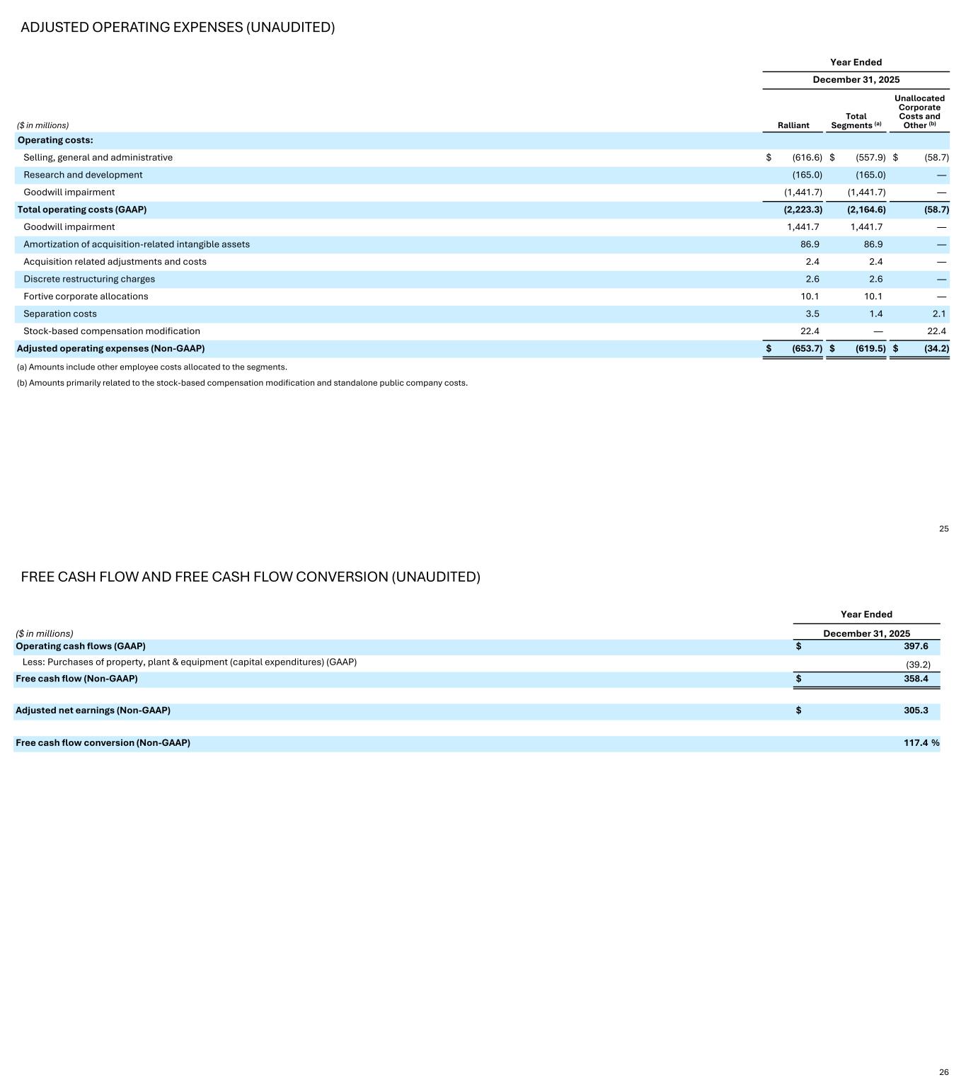 ADJUSTED OPERATING EXPENSES (UNAUDITED) Year Ended December 31, 2025 ($ in millions) Ralliant Total Segments (a) Unallocated Corporate Costs and Other (b) Operating costs: Selling, general and administrative $ (616.6) $ (557.9) $ (58.7) Research and development (165.0) (165.0) — Goodwill impairment (1,441.7) (1,441.7) — Total operating costs (GAAP) (2,223.3) (2,164.6) (58.7) Goodwill impairment 1,441.7 1,441.7 — Amortization of acquisition-related intangible assets 86.9 86.9 — Acquisition related adjustments and costs 2.4 2.4 — Discrete restructuring charges 2.6 2.6 — Fortive corporate allocations 10.1 10.1 — Separation costs 3.5 1.4 2.1 Stock-based compensation modification 22.4 — 22.4 Adjusted operating expenses (Non-GAAP) $ (653.7) $ (619.5) $ (34.2) (a) Amounts include other employee costs allocated to the segments. (b) Amounts primarily related to the stock-based compensation modification and standalone public company costs. 2525 FREE CASH FLOW AND FREE CASH FLOW CONVERSION (UNAUDITED) 2626 Year Ended ($ in millions) December 31, 2025 Operating cash flows (GAAP) $ 397.6 Less: Purchases of property, plant & equipment (capital expenditures) (GAAP) (39.2) Free cash flow (Non-GAAP) $ 358.4 Adjusted net earnings (Non-GAAP) $ 305.3 Free cash flow conversion (Non-GAAP) 117.4 %
