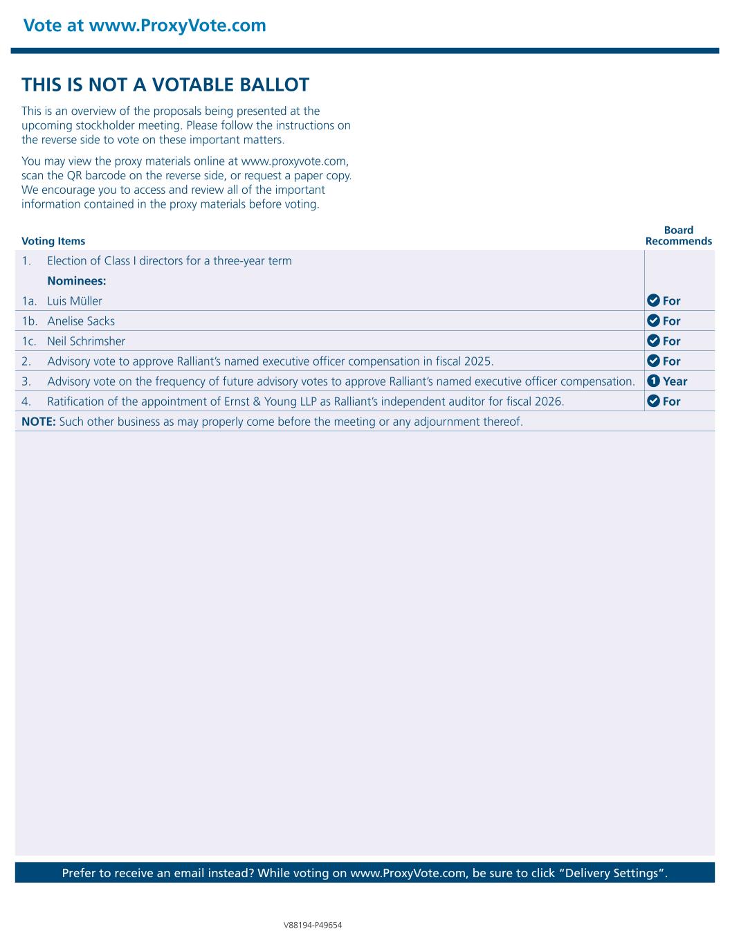 THIS IS NOT A VOTABLE BALLOT This is an overview of the proposals being presented at the upcoming stockholder meeting. Please follow the instructions on the reverse side to vote on these important matters. You may view the proxy materials online at www.proxyvote.com, scan the QR barcode on the reverse side, or request a paper copy. We encourage you to access and review all of the important information contained in the proxy materials before voting. Vote at www.ProxyVote.com Prefer to receive an email instead? While voting on www.ProxyVote.com, be sure to click “Delivery Settings”. Voting Items Board Recommends V88194-P49654 1. Election of Class I directors for a three-year term Nominees: 1a. Luis Müller For 1b. Anelise Sacks For 1c. Neil Schrimsher For 2. Advisory vote to approve Ralliant’s named executive officer compensation in fiscal 2025. For 3. Advisory vote on the frequency of future advisory votes to approve Ralliant’s named executive officer compensation. 1 Year 4. Ratification of the appointment of Ernst & Young LLP as Ralliant’s independent auditor for fiscal 2026. For NOTE: Such other business as may properly come before the meeting or any adjournment thereof.